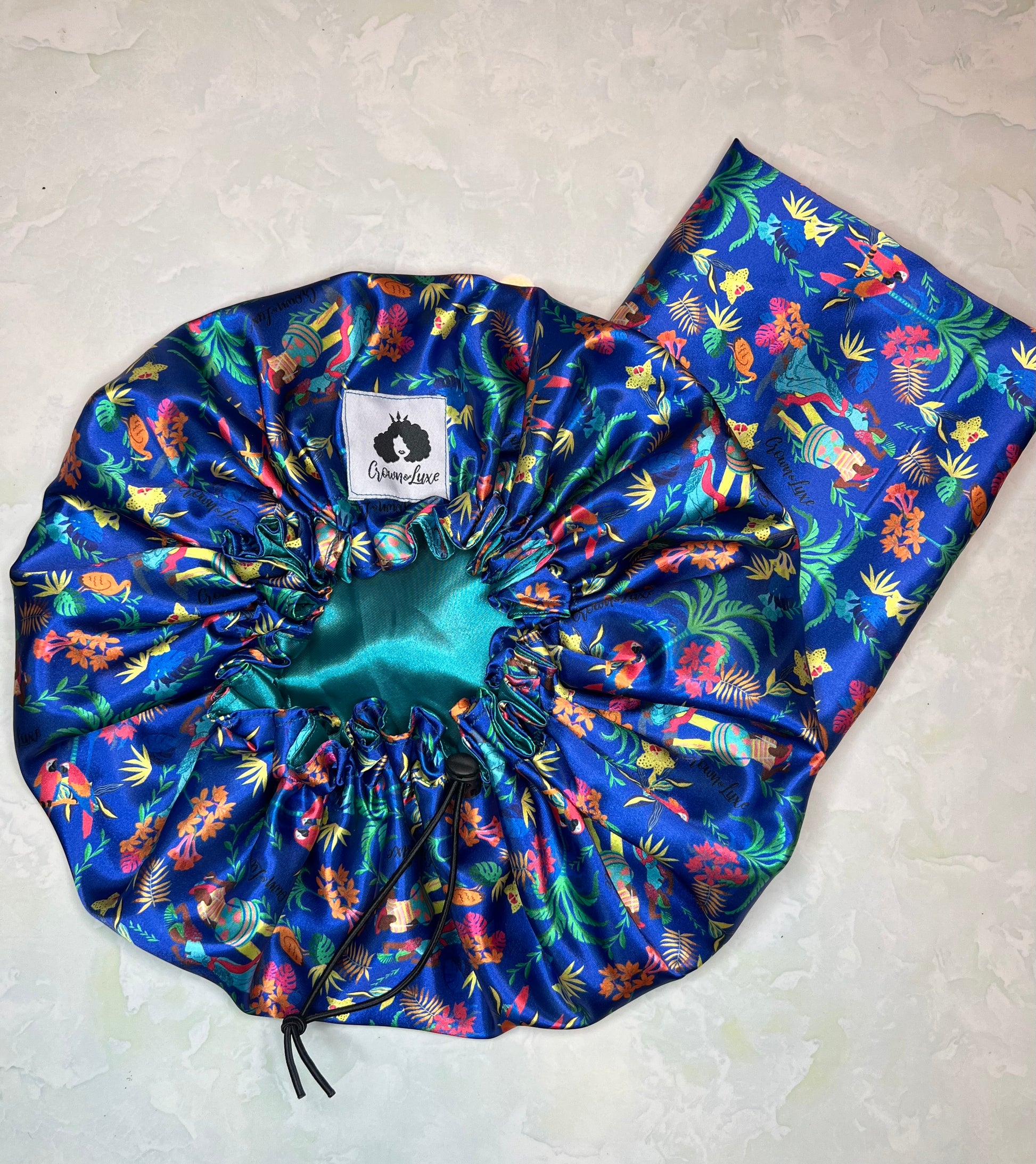 The bonnet is reversible and made with 100% satin for Adults and fit up to mid length hair. Big and roomy enough for braided styles, locs.